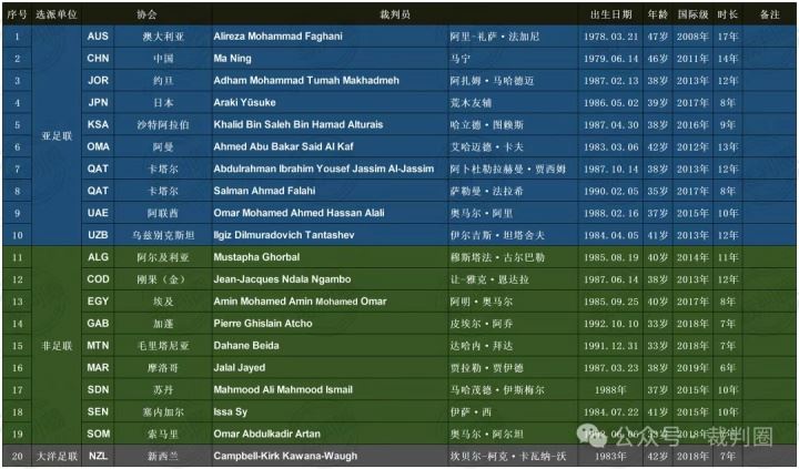 本期培训名单来自亚洲足联、非洲足联和大洋洲足联,有19个协会共20名裁判员参加,其中包括亚足联9个协会的10名裁判员、非足联9个协会的9名裁判员、大洋足联1个协会的1名裁判员。